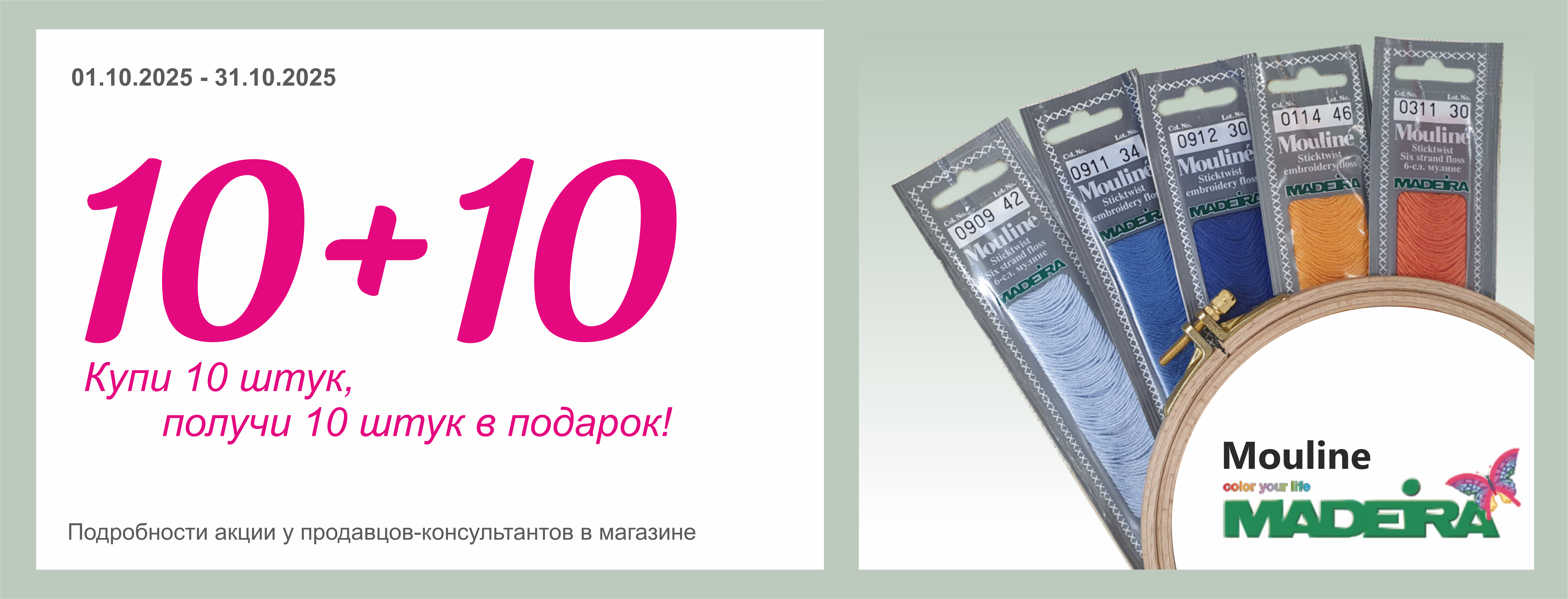 Пришла пора запасаться нитками мулине! Потому что в Швейном мире проходит специальная Акция: до 31.10.2025, при покупке 10 ниток для вышивания Mouline Madeira еще 10 вы получаете в подарок!